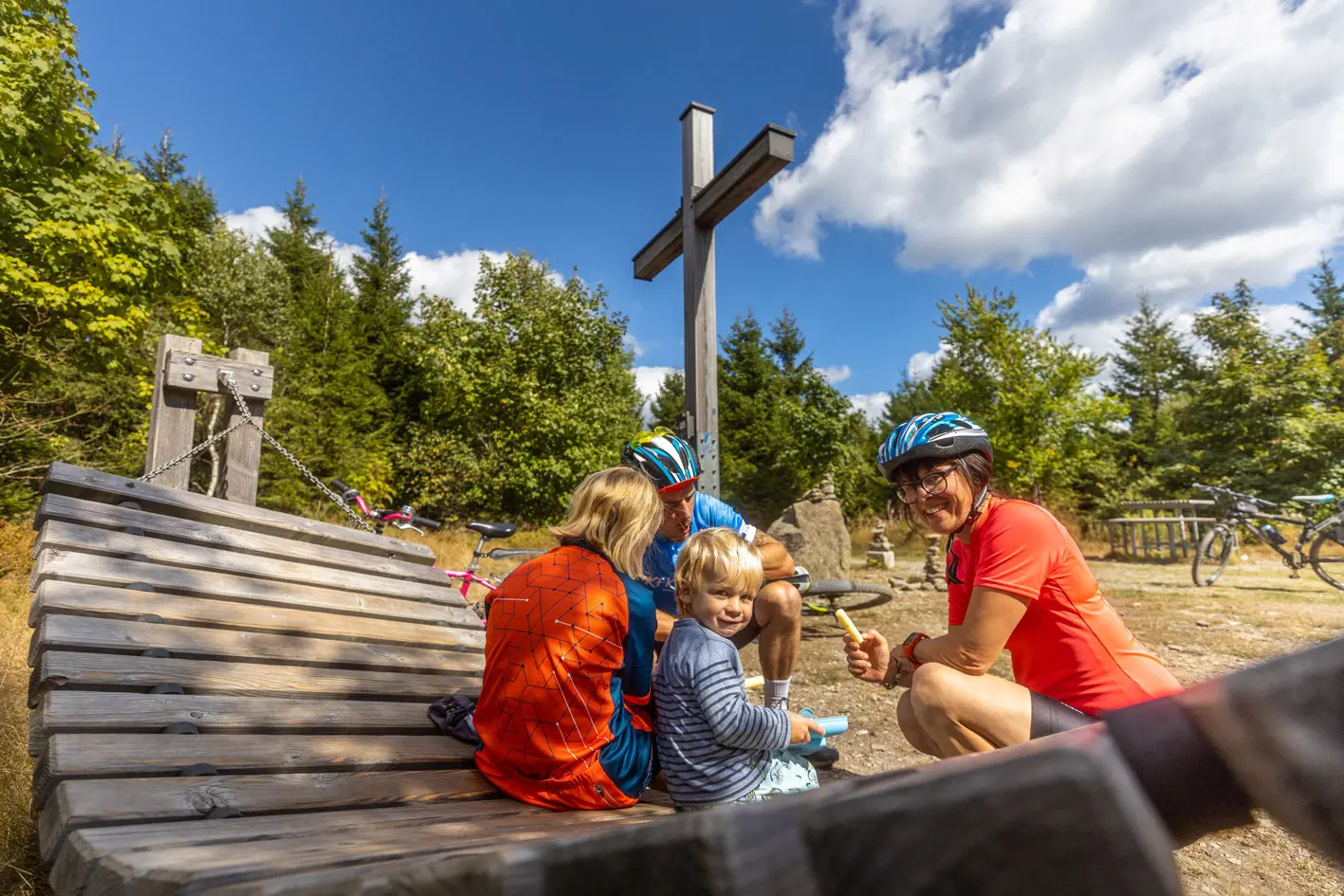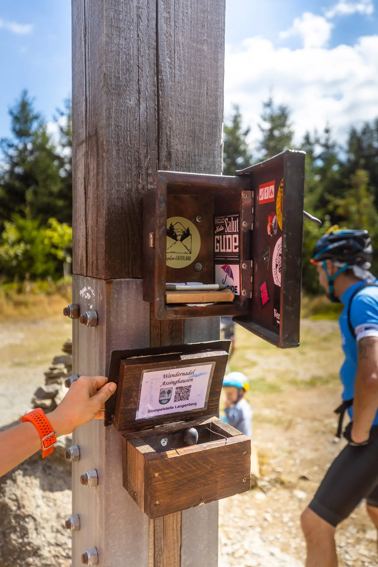 Mit 843,50 Metern ist er der höchste Berg des Rothaargebirges und in Nordrhein-Westfalen. Anders als viele der anderen 800er in seiner näheren Umgebung besitzt er allerdings keinen Fernblick. Dafür jedoch eine der wunderbaren Rothaarsteig-Hängematten, die geradezu auf unsere Mountainbiker zu warten scheint.