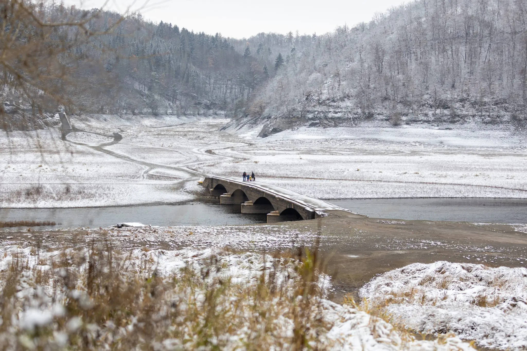 Nun gibt die Brücke den Landweg zur gegenüberliegenden Seite frei. Da unsere Edertaler noch einiges an Wegstrecke vor sich haben, statten sie allerdings nur der Brücke nur einen kurzen Besuch ab. Sie lassen es sich jedoch nicht nehmen, auch noch ein wenig durch das Bett des leeren Sees zu wandern – wenn es nicht gerade gefroren ist, eher eine matschige Angelegenheit.