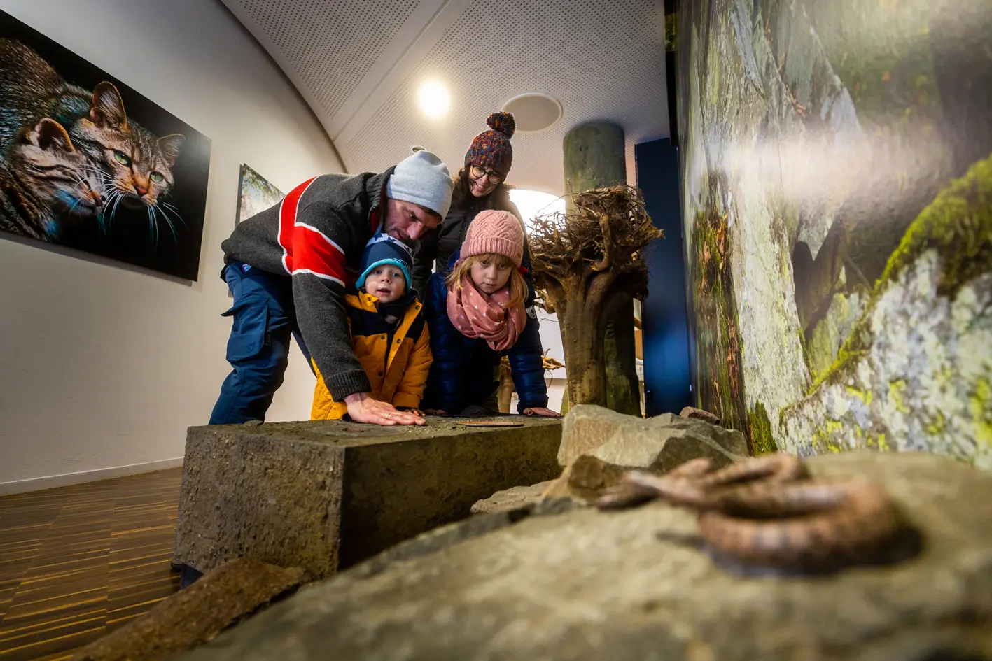 Auch die UrZeit hat es der Familie angetan. Sie verrät, wie sich die Wälder des Nationalparks entwickelt haben und wie sich der Nationalpark in Zukunft entwickeln wird. Außerdem erfährt man im WaldWerk, dem großen Panorama-Bereich der Ausstellung, viele interessante Details über die unterschiedlichen Waldbewohner.