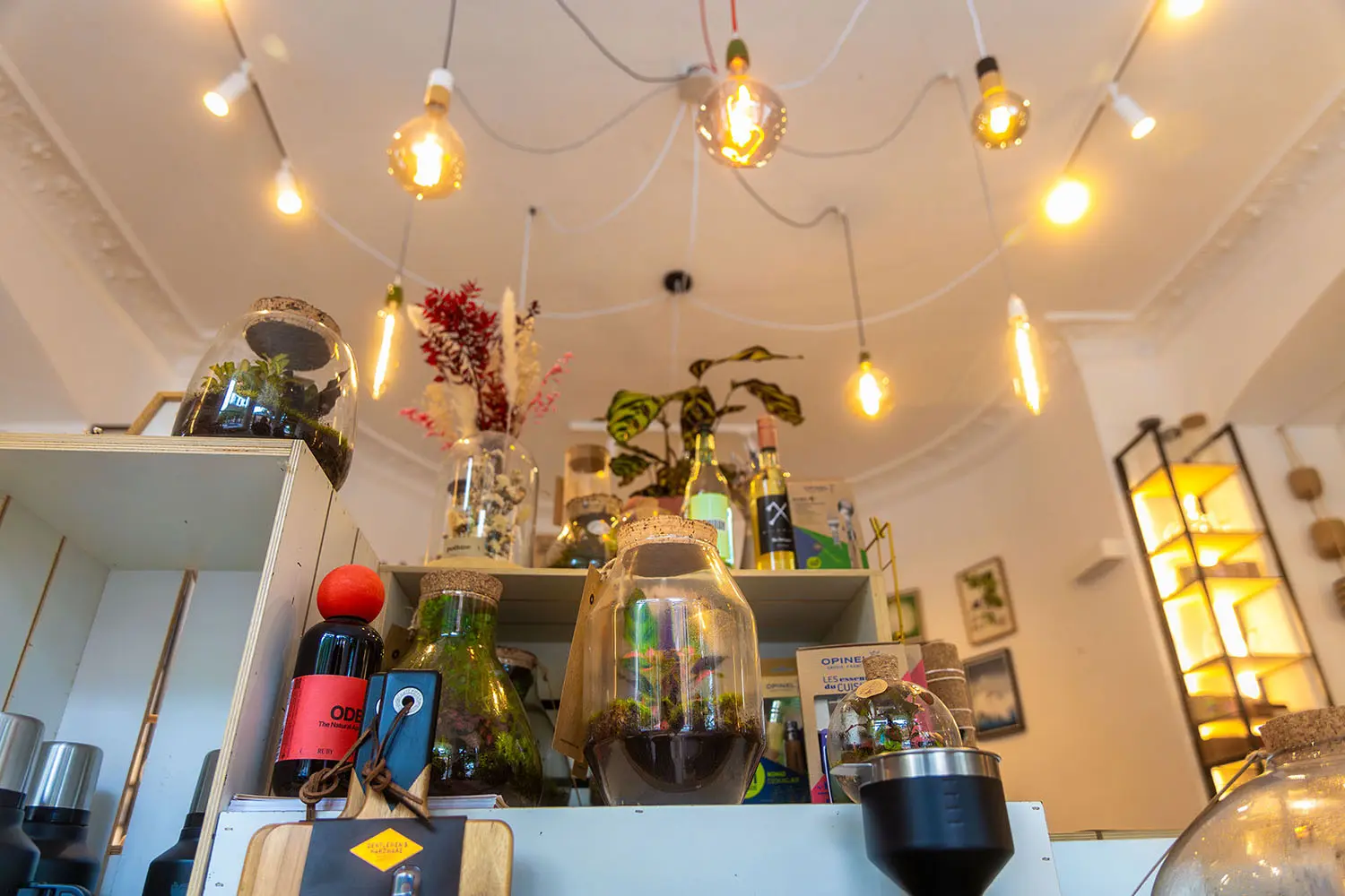 Wir könnten Stunden im Laden verbringen. Hier entdecken wir unfassbar viele ausgefallene Must-haves. Dinge, die du nicht brauchst, aber unbedingt haben musst. Von der Decke hängen bizarre Glühbirnen, fast im Steampunk-Look. Wir finden Pflanzen unter Glashauben und kolorierte Zeichnungen in klassisch englischem Style mit jener Prise Humor, die du so nur in England findest. Zwischen Bekleidung, Geschirr und Tassen fällt uns ein Kassel-Poster ins Auge, passend mit Waschbär-Motiv. All das sorgt für einen Haufen Spaß. Es ist voll und üppig.