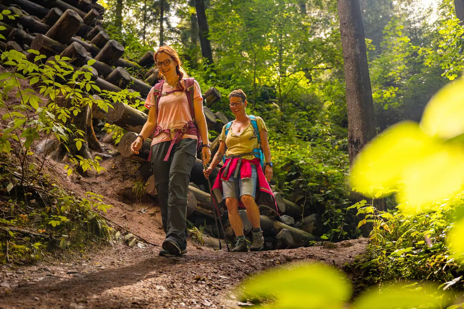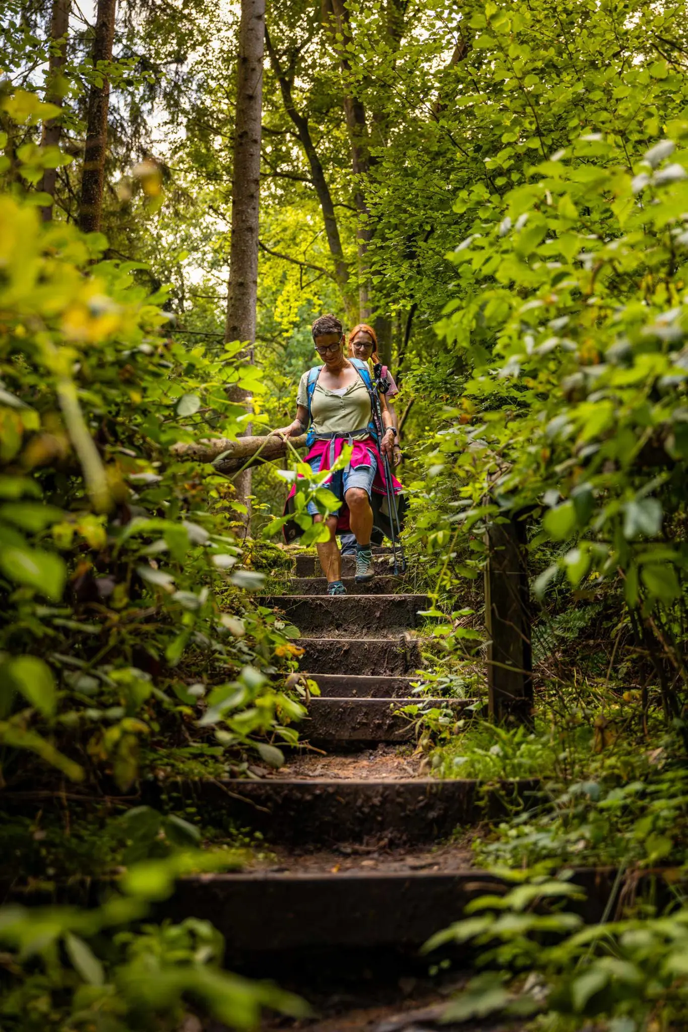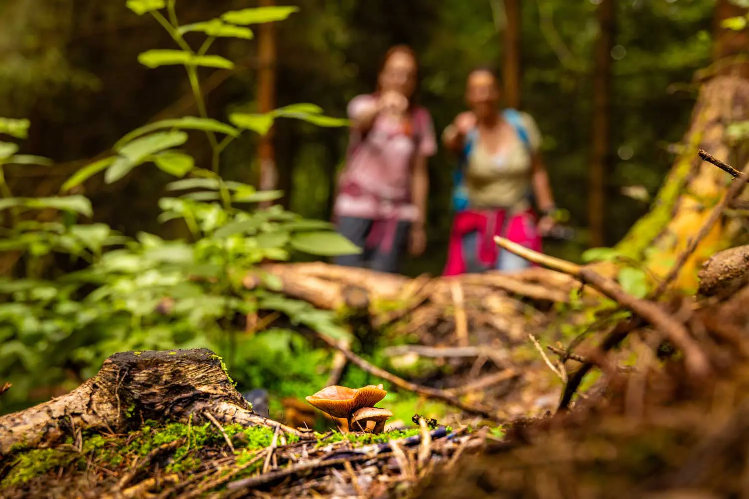 Dichter, kühler, grüner Wald mit herrlichen Lichteinbrüchen mit warmen Sonnenstrahlen, Vogelgezwitscher, leise plätschert der Bach, dicke Baumwurzeln, mit Moos bewachsen, die aus dem Waldboden ragen, und jetzt zur Herbstzeit die breite Palette an Pilzsorten. Immer wieder findet man auf der Wanderstrecke Sitzbänke und Tische oder aber große, bizarre Steine, die einen zum Verweilen, Genießen und Entschleunigen einladen.