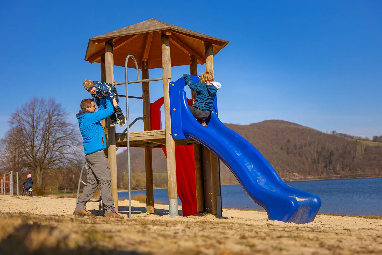 Nun denn, bis letztendlich alle im Familien-Kleinbus auf ihren Plätzen saßen und angeschnallt waren, verging dann doch noch ein Weilchen, bevor es dann endlich losging. Ihr kennt das sicherlich von zuhause auch, oder? Papa, wo fahren wir jetzt eigentlich genau hin? fragte Paula. Es geht an den Diemelsee. Oh cool, sagte Theo, den kenne ich ja noch gar nicht. Kennst du den See? fragte Theo seine große Schwester Paula. Nein, ich war da, glaube ich, auch nicht und bin schon ganz gespannt. Mama Anne erklärte den beiden, dass der Diemelsee ein idyllisch gelegener Stausee ist, quasi mitten im Herzen des Sauerlandes liegt und umgeben von ganz viele dichten Wäldern und grünen Wiesen ist. Daher eignet sich der Diemelsee für viel verschiedene Freizeitaktivitäten, und rund um den See gibt es sehr viele Rad- und Wanderwege, um die fantastische Naturlandschaft dort zu entdecken.