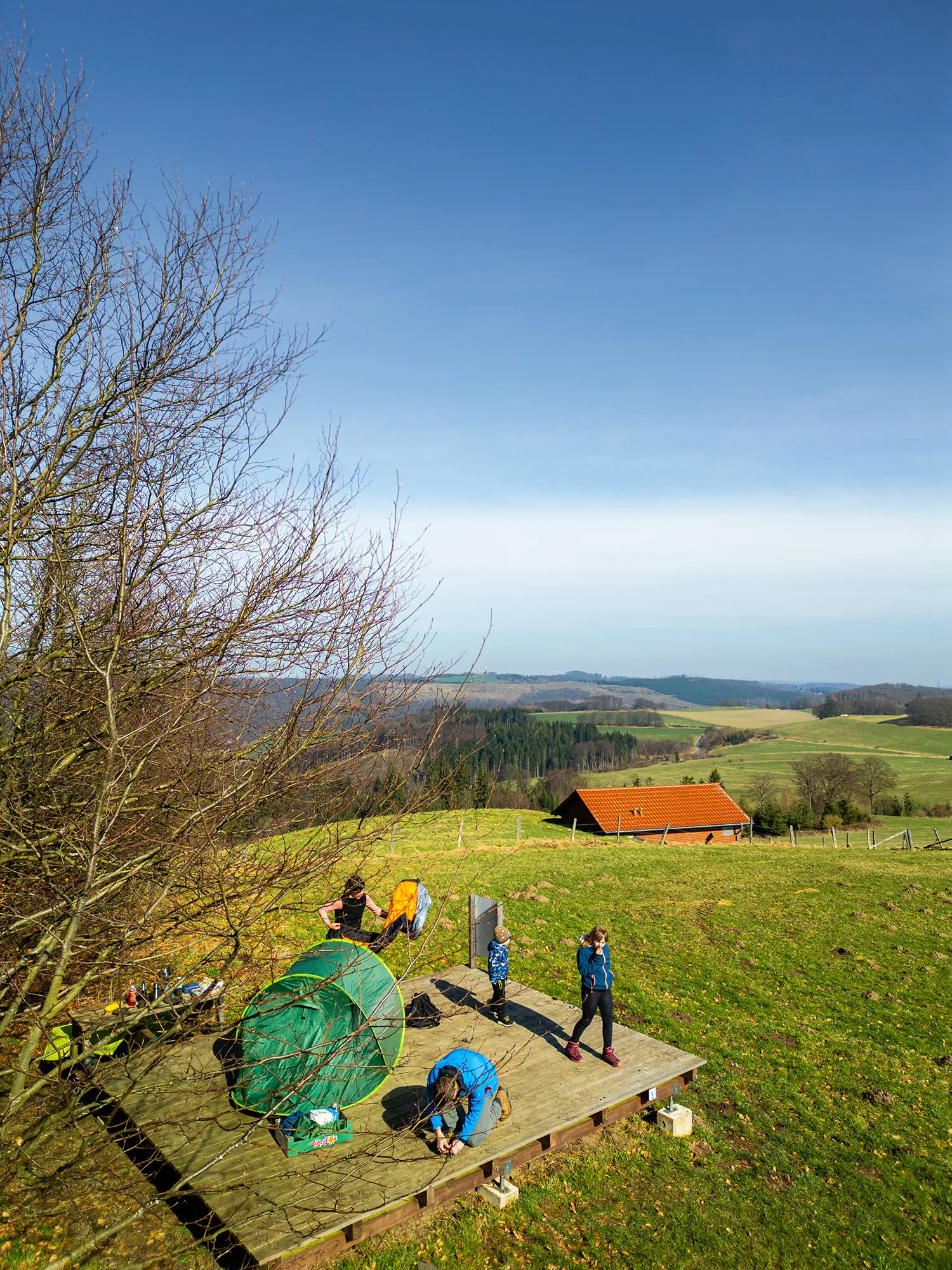 Zwischenzeitlich sind die fünf auch mit dem Kleinbus am Zielort angekommen, und Mama Anne fragt in die Runde: So, wir sind da, es kann losgehen! Seid ihr alle bereit für das große Wochenend-Abenteuer? WOCHENEND-Abenteuer? fragte Paula erstaunt mit immer größer werdenden Augen. Ja, genau! Der Papa hat diese Woche für uns mal eine Übernachtungsmöglichkeit mit einer grandiosen Aussicht, also ein ganz besonderes Erlebnis gebucht. Denn wir schlafen heute mal da, wo Fuchs und Hase sich auch gute Nacht sagen – am Waldrand unter freiem Himmel im Zelt. Mit viel frischer Luft, spannenden Nachtgeräuschen und dem besten Blick auf Mond und Sterne inklusive. Wenn wir morgen früh dann unser Frühstück dort an der Übernachtungsplattform genossen haben, können wir gut gestärkt in unseren Wandertag starten!