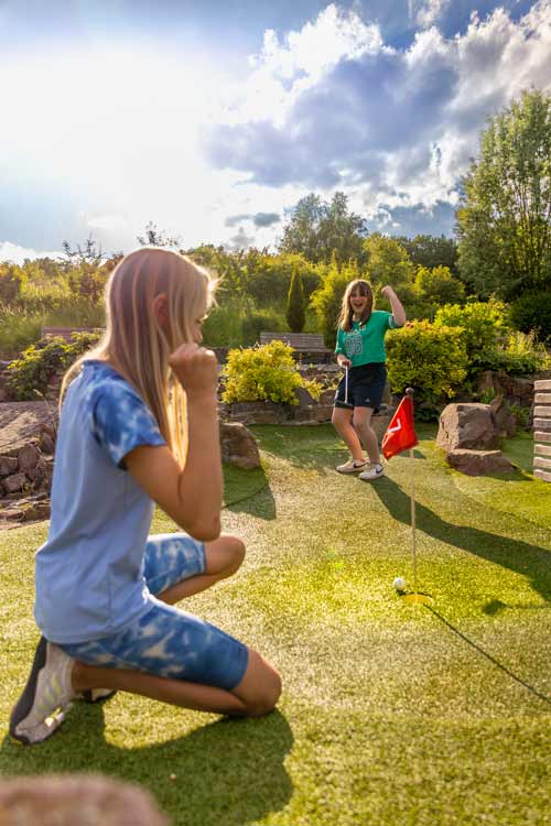Die neu errichtete Minigolfanlage entführt uns in eine andere, kleine Märchenwelt mit liebevoll angelegter Hügellandschaft und Kunstrasen. In der Mitte entspringt ein kleiner Bach. Wir scherzen und warten auf die Teletubbies, die bestens in diese weiche Hügellandschaft passen würden. Es tut uns allen gut, nach so viel Action etwas Ruhigeres zu unternehmen. Tatsächlich gestaltet sich das Spiel auf der Anlage kurzweilig und hält uns bei Laune. Dabei ist es gar nicht so einfach, das Loch zu treffen.