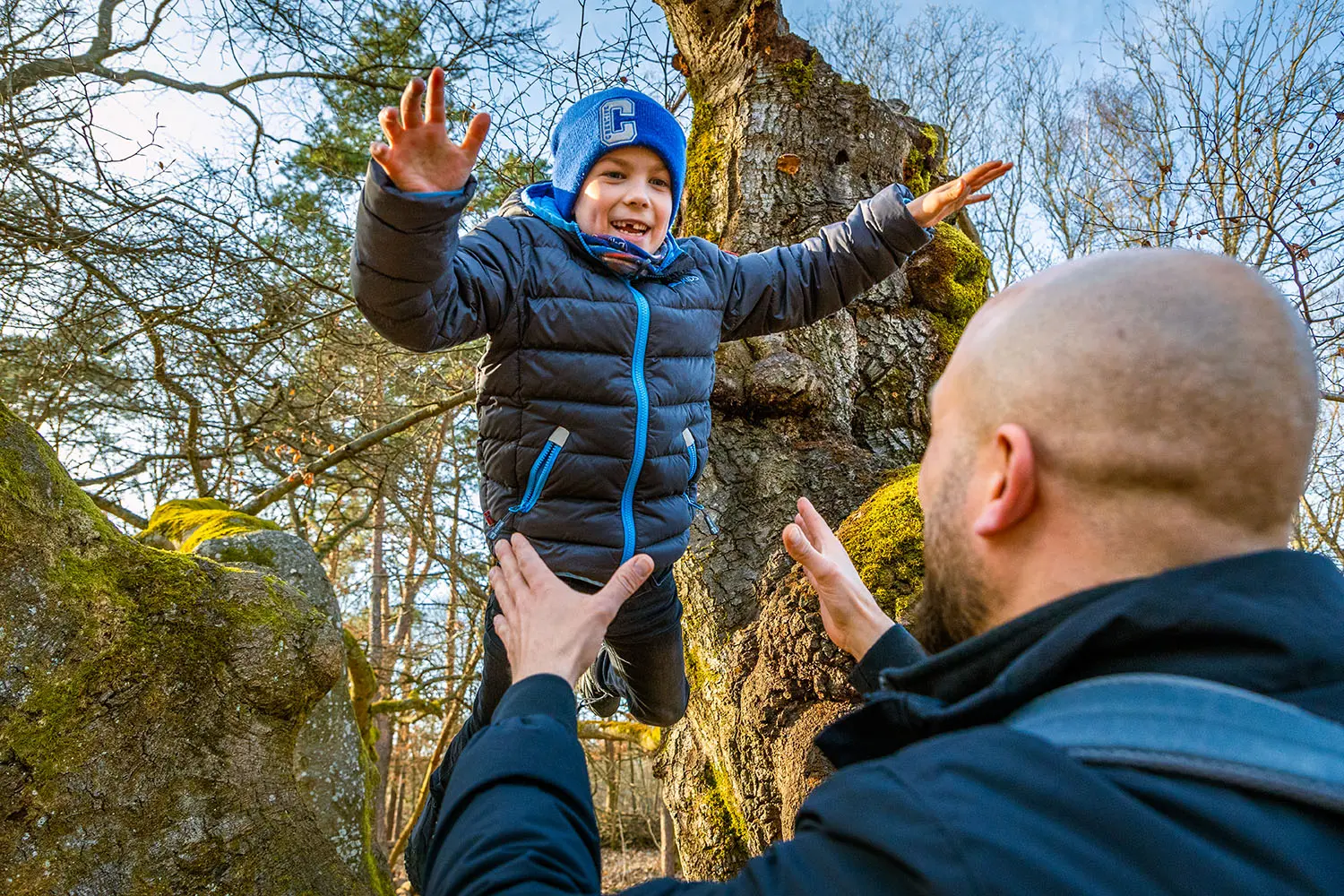 Tatsächlich genießen wir den Augenblick, und die Zeit scheint keine Rolle zu spielen. Bald staunend, bald neugierig bewundern wir die Bäume. Allmählich bekommen wir jedoch Hunger von der Wanderung. Ein Picknick wäre super. Glücklicherweise haben wir alles dabei, und vor solch einer Kulisse ist es ein Erlebnis, zu rasten. Am Hutewald stoßen wir schnell auf eine Grillhütte mit Tischen und Bänken. Bestens geeignet für eine Pause. Direkt neben der Grillhütte liegt eine große Wiesenfläche, ideal zum Spielen. So können sich die Kinder erstmal austoben, während die Eltern die Umgebung in vollen Zügen genießen. Hier halten wir es lange aus, bis wir alle langsam müde werden. Das ist nicht schlimm, denn der Weg zum Auto ist nur noch ein kurzes Stück leicht bergab zu laufen.