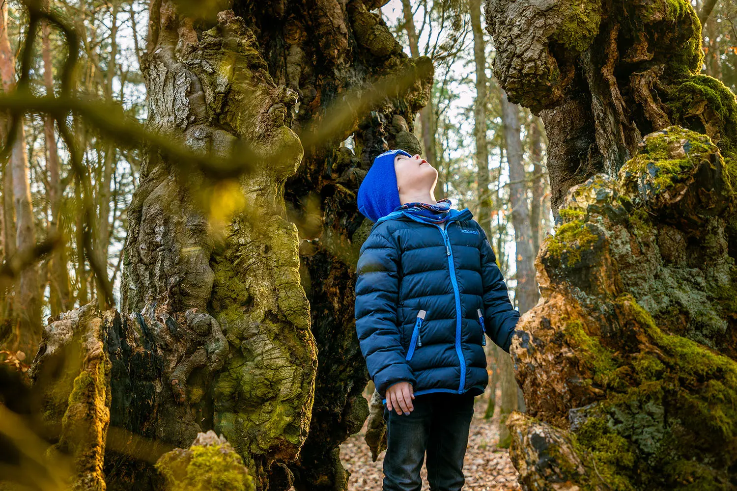 Die Bäume stehen unter strengem Schutz. Sie sind ein Schatz der Natur. Vögel nutzen die abgestorbenen Teile der Bäume als Nistplätze, und seltene Insekten, wie verschiedene Hirschkäferarten, leben im toten Holz. Hier kannst du den Kreislauf des Lebens hautnah erleben. Die Natur als gigantische Recyclinganlage. Neben den alten Baumriesen stehen junge, frische Bäume. Sie werden in ferner Zukunft als nächste Generation im Hutewald stehen, um ihn unvergänglich zu machen. Respektvoll und ehrfürchtig bestaunen wir die Relikte vergangener Zeit. Hutewälder sind selten zu finden. Am Halloh erlebst du ein unvergleichliches Juwel der Natur – genieße die ehrwürdige Umgebung mit Respekt. Stell dir vor, was diese Bäume in ihrem langen Leben bereits erlebt haben. Wir fühlen uns belanglos, aber glücklich, diesen Wald genießen zu dürfen. Natürlich sind die Bäume empfindlich und leicht verletzlich. Bitte gib acht. Sie haben es verdient, gut behandelt zu werden.