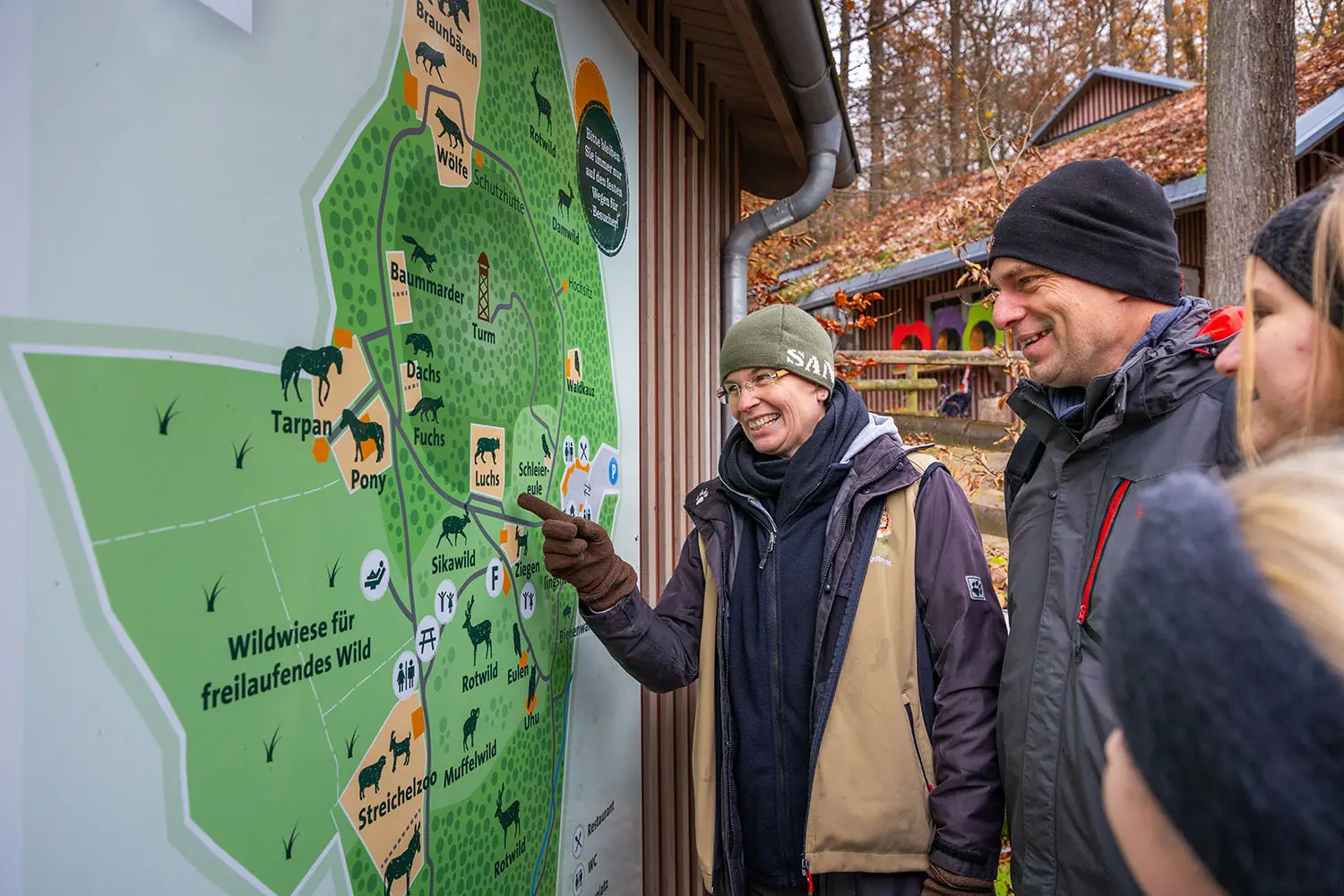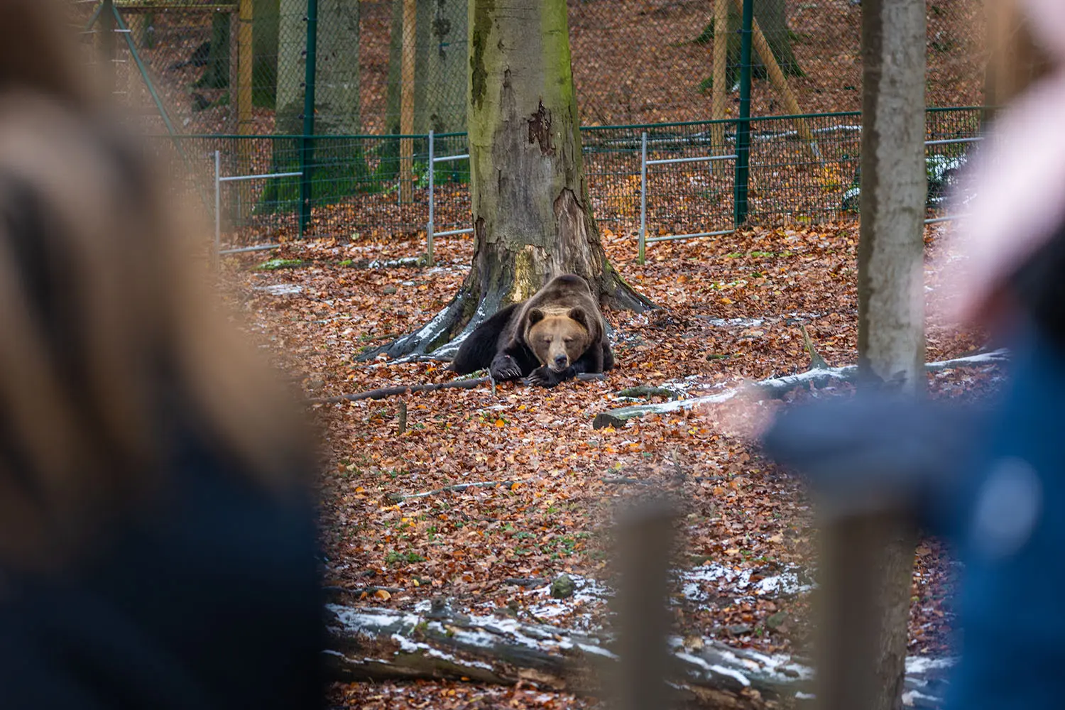 Der Parkplatz vor dem Park ist ziemlich leer. Nur wenige Besucher finden den Weg in den Wildpark in dieser Jahreszeit. Doch gerade deshalb ist es interessant, hierher zu kommen. Schnurstracks führt der Weg zum Kassenhäuschen, wo uns ein netter Mitarbeiter begrüßt. Wir zahlen den Eintritt, und bevor wir das eigentliche Gelände betreten, begrüßt uns die Wildparkleiterin Sara Engelbrecht. Sie freut sich auf unseren Besuch und teilt uns voller Stolz mit, dass wir alle Tiere noch ohne Winterschlaf bestaunen können. Glücklicherweise gibt sie uns den Hinweis, am Eingang etwas Tierfutter mitzunehmen. Wie sich herausstellen wird, ist dieser Tipp wirklich wertvoll. Wir erfahren von ihr, dass es in diesem Wildpark auch Bären gibt. Jetzt sind wir gespannt, was uns erwartet.