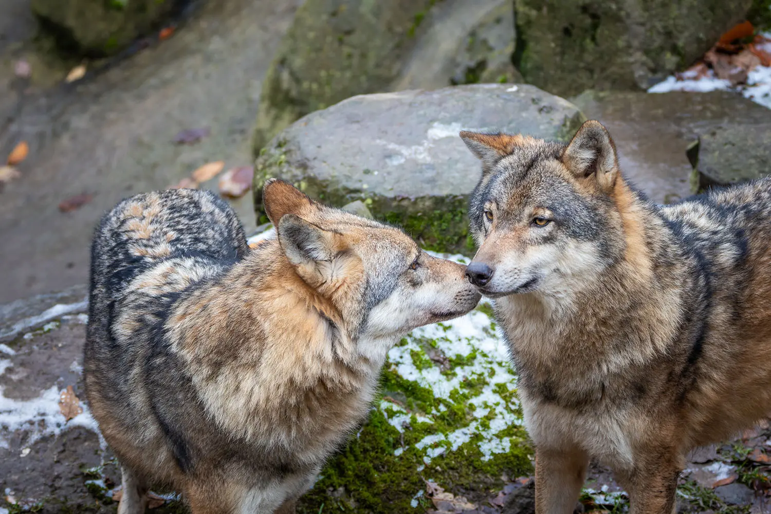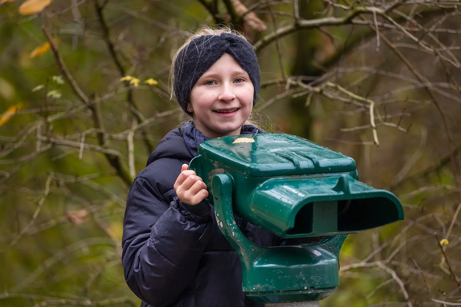 Die Wölfe tragen bereits ihr Winterfell und wirken ebenfalls gemütlich kuschelig. Um die Tiere besser und aus nächster Nähe beobachten zu können, stehen Fernrohre parat, die besonders unsere Kinder interessieren. Wir können alles in Ruhe erkunden und auszuprobieren.