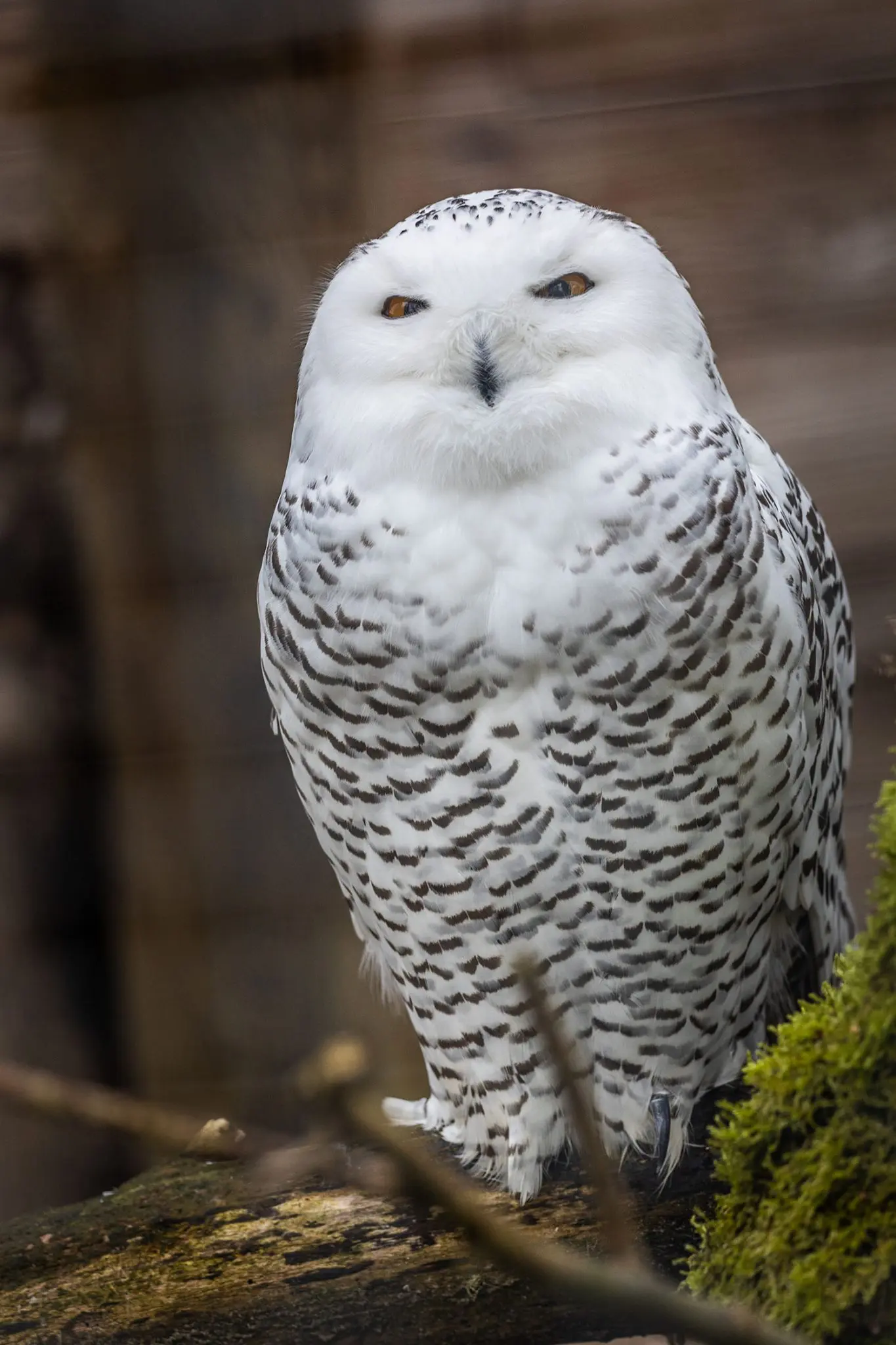 Ein großes, überdachtes Gehege lässt uns ahnen, dass hier wohl Vögel zu Hause sind. Zunächst sehen wir nichts, doch plötzlich erspähen wir, perfekt getarnt, zwei Uhus. Sie sitzen regungslos auf Ästen und schauen uns mit ihren leuchtenden Augen an. Die Augen sind in der Tat faszinierend, in strahlendem, tiefem Orange, als würden sie in unsere Köpfe eindringen. Direkt daneben finden wir, gut sichtbar, die weiße Variante dieser großartigen Vögel. Es ist eine Schnee-Eule. Sofort erkennen wir die Ähnlichkeit zu Harry Potters treuer Eule Hedwig.