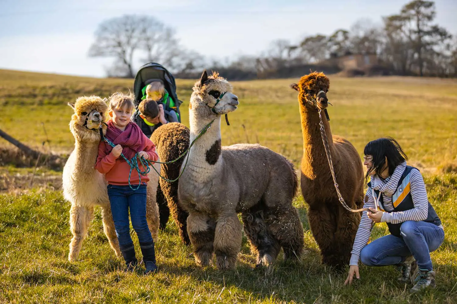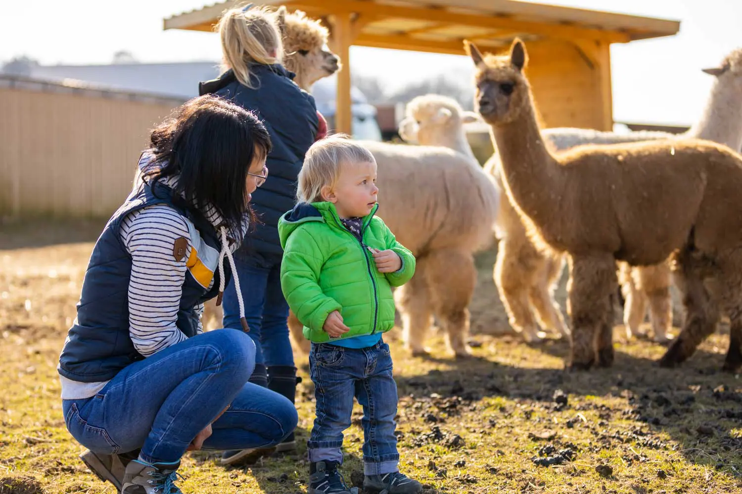 „Wenn du Hilfe brauchst, sag Bescheid“ ruft Anke lachend einem großen Wollknäuel zu, aus dem ab und an eine Kinderhand erscheint, um kurz darauf wieder zu verschwinden. Doch Paula hat alles im Griff und weist die neugierigen Alpakas immer wieder mit einem strengen Blick, gefolgt von einem beherzten Kichern, zurecht. Mama Anne beobachtet das bunte Treiben mit hochgezogenen Augenbrauen, wendet sich dann aber wieder Klein-Theo zu, der sich mit tollpatschigen Schritten einen Weg durch die Alpakas bahnt.