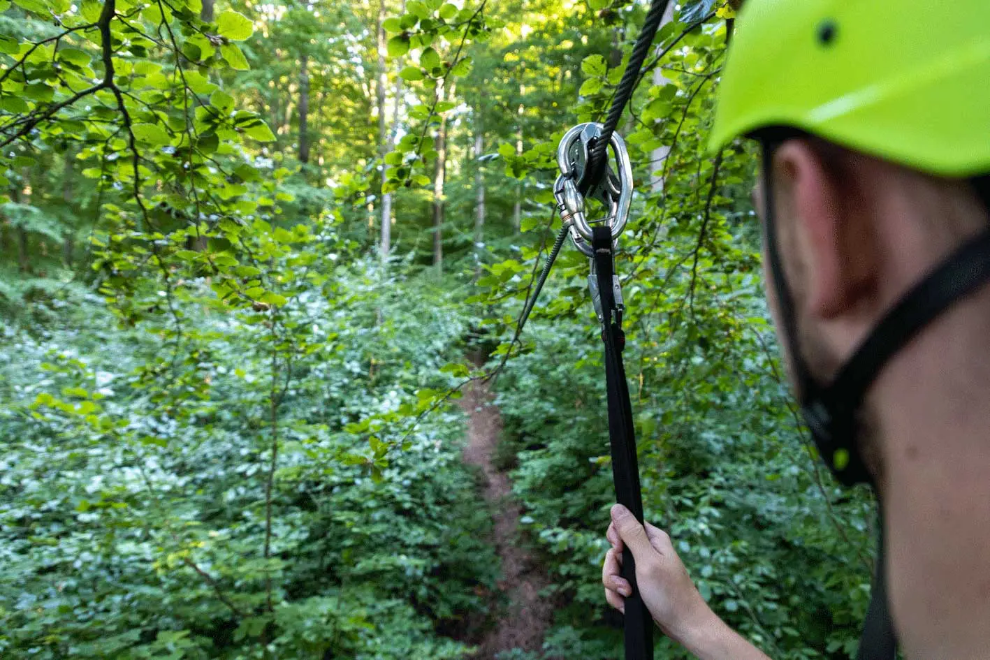 Auf der gegenüberliegenden Seeseite zum Beispiel thront Schloss Waldeck und ist von den zahlreichen Plattformen des Seilgartens gut zu erkennen. Doch inmitten des alten Baumbestandes, zwischen Stämmen und Kronen, oberhalb des steil ansteigenden Waldbodens, da vergisst man schnell, was weiter weg passiert. All die Reize, die hier oben auf die Sinne wirken, blenden das Draußen im Handumdrehen aus: Das dichte Rauschen des Blätterdachs, der Waldgeruch oder der Fokus auf das nächste Element im Seilgarten.