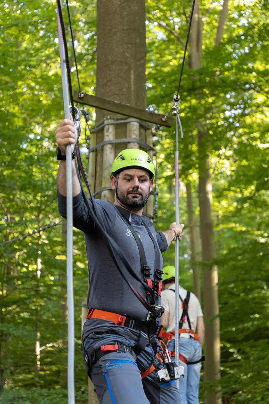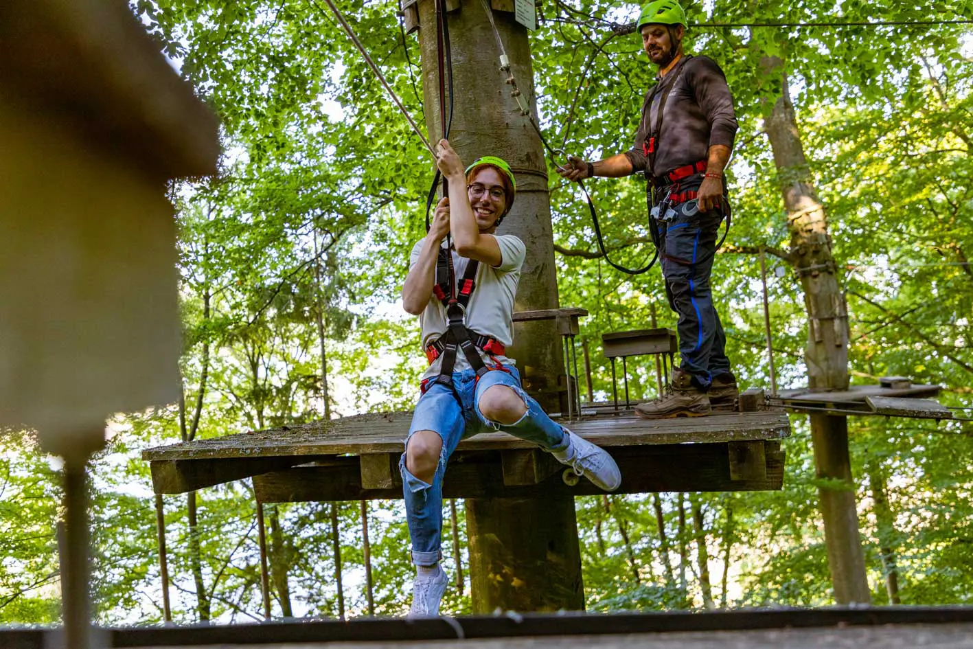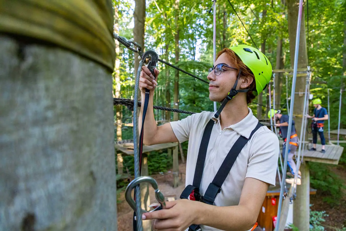 Dass das alles so reibungslos und für die Besucher sorgenfrei ablaufen kann, liegt an dem von Anfang an umgesetzten Qualitäts- und Sicherheitsniveau des Kletterwaldes. Absolut naturverträglich und gleichermaßen professionell installiert wurde die Anlage 2008 durch eine spezialisierte Fachfirma. Die tägliche Sichtprüfung sowie mehrfach in der Saison stattfindende Funktionsprüfungen obliegen zwar dem Betreiber einer solchen Anlage. Doch zusätzlich kontrolliert einmal pro Jahr der TÜV den Kletterwald und geht sicher, dass die Anlage der anerkannten Norm für Seilgärten entspricht.