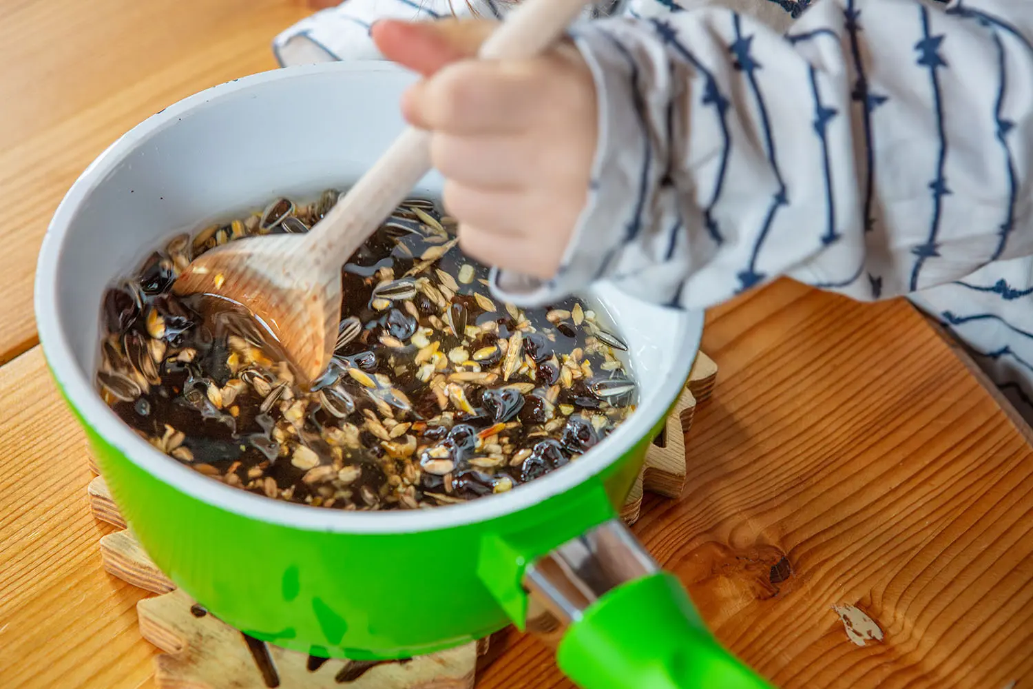 Natürlich wollen wir ihnen helfen, und gerade für Kinder ist es wichtig, Hilfsbereitschaft zu vermitteln. Da kommt uns die zündende Idee: Wir hängen Meisenknödel raus, damit den Vögeln geholfen wird. Ganz so einfach machen wir es uns jedoch nicht, und so beschließen wir, mit Charlie etwas für die Vögel zu „kochen“. Das macht vor allem auch richtig Spaß für Kinder.