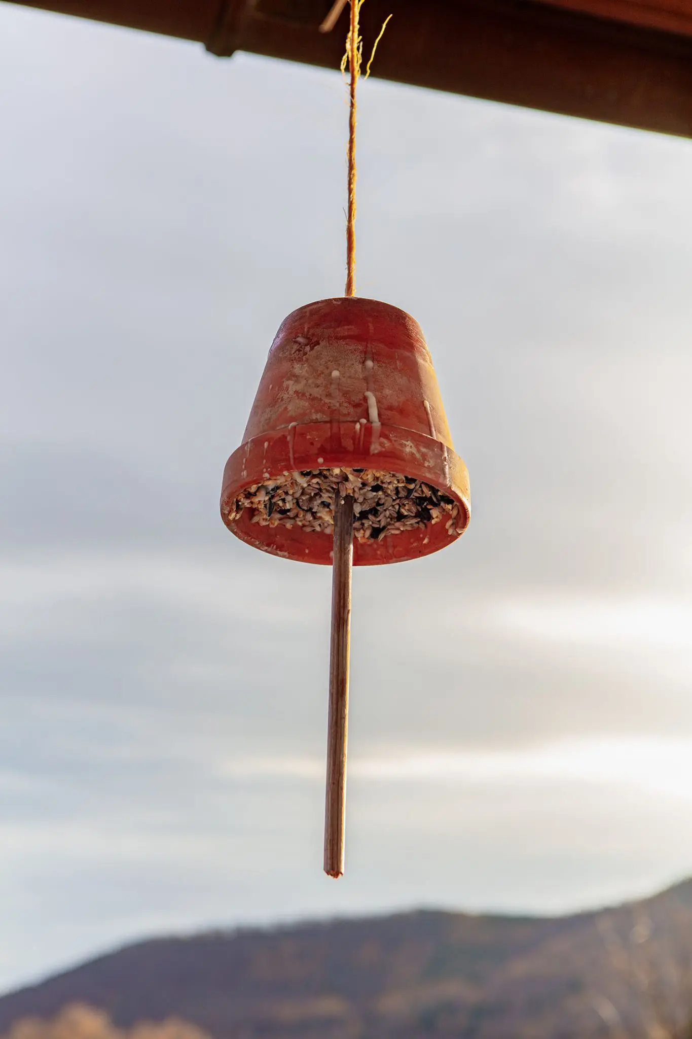 Es gibt unterschiedliche Möglichkeiten, Meisenknödel herzustellen. Am einfachsten machst du sie in einer Donutform. Dann hast du in der Mitte eine Öffnung, um sie mit einem Faden aufzuhängen. Wir haben uns für eine andere Variante entschieden: ein umgedrehter Terracotta-Blumentopf. Diesen kannst du kopfüber aufhängen. Er ist dadurch vor Schnee und Regen geschützt. Wichtig ist allerdings, dass du in der Mitte einen Stab einbaust, damit die Vögel dort bequem rasten können.