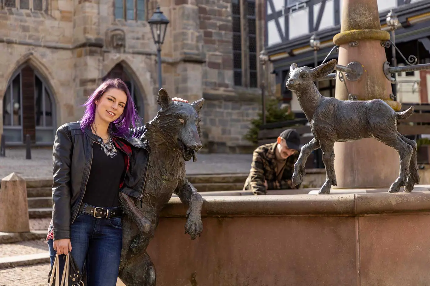 Ein ganz besonderes Highlight und beliebtes Fotomotiv ist der Märchenbrunnen auf dem Kirchplatz. Und welches Grimm-Märchen bietet sich wohl perfekt für Wolfhagen an? Natürlich „Der Wolf und die sieben Geißlein“! Somit findet ihr dort einen lebensgroßen Bronze-Wolf mit einem dicken Bauch voller Steine und das siebte Geißlein. Wisst ihr eigentlich noch, was der Wolf in dem Märchen sagte, als er bei den Geißlein an die Tür klopfte?
